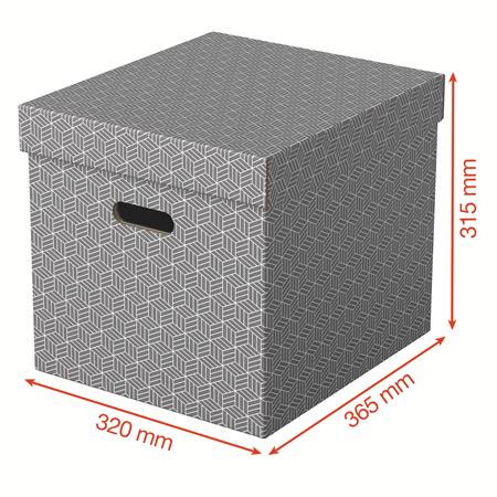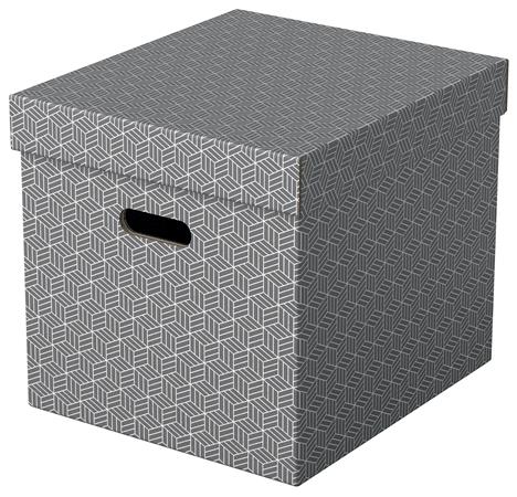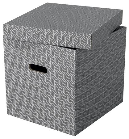 Súprava troch veľkých lepenkových úložných kociek s moderným a štýlovým geometrickým dizajnom.