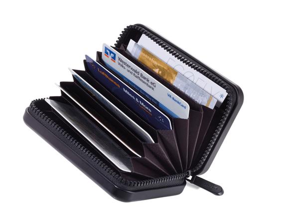 Uchovávajte svoje bankové karty v štýlovom puzdre s pevným obalom a dizajnom kufra. -rozmery: 70 x 105 x 30 mm -zapínanie na zips -materiál: hliník a polyester -RFID ochrana -9 priehradiek -kapacita: 20 kariet