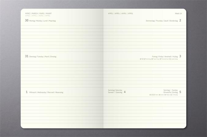 -týždenné rozvrhnutie (2 strany = 1 týždeň) -mesačný a ročný plánovač na roky 2026/2027 -gumička na uzatváranie -držiak na pero na bočnej strane -vnútorné rohové vrecko a archivačné púzdro -s označovacou páskou -s mapou sveta - s tabuľkou veľkostí -papier chamois, 80 g/m² -v zadnej časti perforované  listy na poznámky -s nálepkami -rozmery: 135x210x16 mm -jazyk: DE/ENG/FR/NL