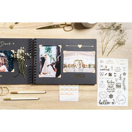 Súprava obsahuje: -scrapbook -12 metalických popisovačov špeciálne určených na čierny papier -2 hárky pastelových nálepiek (230 ks) -2 hárky zlatých nálepiek (75 ks) -2 šablóny -48 rámikov na fotografie
