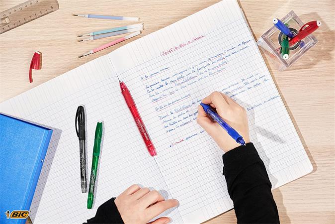 písaný text zmizne v dôsledku prešúchania gumou na konci vrchnáka (dá sa neobmedzene veľa krát prepisovať a znova mazať)