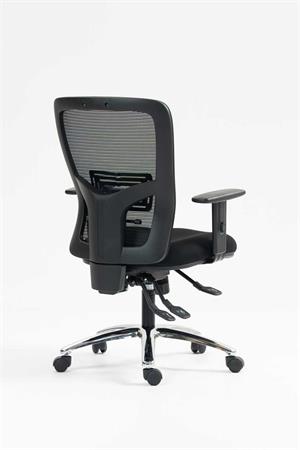 Kancelárska stolička s pohodlným sedadlom dizajnové prevedenie s hrubým, tvarovaným polstrovaním sedadla pre vyšší komfort pri sedení výškové nastavenie pomocou plynového piestu vyvýšené, priedušné sieťované operadlo s nastaviteľnou bedrovou opierkou výšku operadla je možné nastaviť pomocou račňového mechanizmu: jednoducho, jedným pohybom asynchrónna mechanika nastaviteľný uhol operadla nastaviteľný uhol sedadla nastaviteľná hĺbka sedadla nastaviteľná výška opierok nosnosť: 160 kg Poťah: sedadlo: protioderová látka operadlo: napnutá sieťovaná tkanina