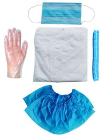 Obsah sady: 1 pár fóliových rukavíc (L), 1 pár modrých PE návlekov na obuv, 1 ks modrá harmoniková sieťka na vlasy, 1 ks 3-vrstvové ochranné rúško, 1 ks biely PP plášť na suchý zips ( XL).