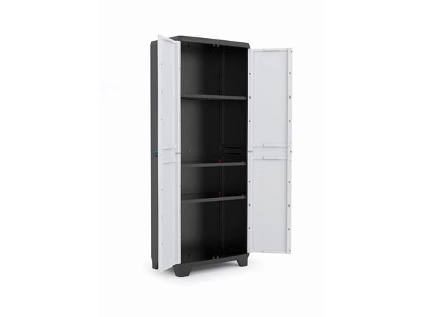 Odolná plastová  skriňa vhodná do garáže, na chatu, na terasu alebo do pivnince. - jednoduchá montáž a údržba - dvere uzamykateľné visiacim zámkom (nie je súčasťou balenia) - 3 nastaviteľné police s nosnosťou 15 kg/polica - nastaviteľné nôžky - s certifikátom TUV GS -rozmery skrine: 68x39x173 cm (šírka x hĺbka x výška) - rozmery políc: 63x33 cm - celková hmotnosť: 12,5 kg