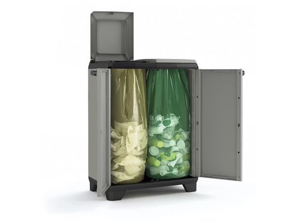 KETER Planet štýlovo a jednoducho prispieva k ochrane životného prostredia.Jeho moderný dizajn sa hodí do každého priestoru.  -vhodná na uloženie dvoch vriec s objemom do 110 litrov -vyrobený z 80% recyklovaného plastu -ľahko sa čistí - jednoduchá montáž -vybavená dvoma hornými vekami so špeciálne tvarovanými otvormi pre jednoduché otváranie - predné dvojkrídlové dvierka s pohodlnými úchytkami - s nastaviteľnými nohami -rozmery: 39x68 x92 cm (šírka x hĺbka x výška) -hmotnosť: 5,96 kg - vrecia nie sú súčasťou balenia