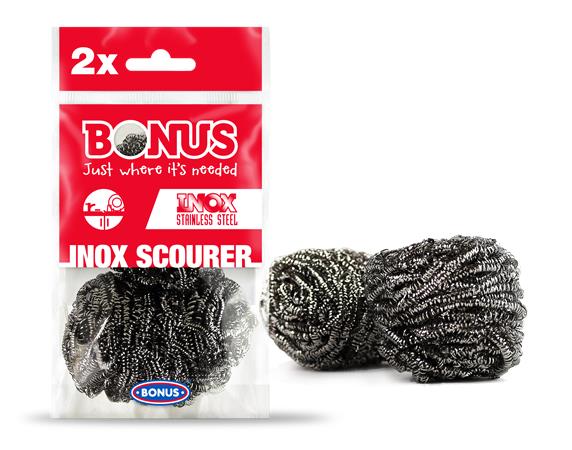Zvláštnosťou špirálovej kovovej drôtenky BONUS INOX je to, že je vyrobený zo stočenej nehrdzavejúcej ocele. Mimoriadne efektívny vďaka svojej pružnosti a jemným oceľovým vláknam jemne trie a možno ho použiť na odstránenie zvyškov jedla spálených v pekáči, proti vodnému kameňu alebo dokonca na čistenie rúry.