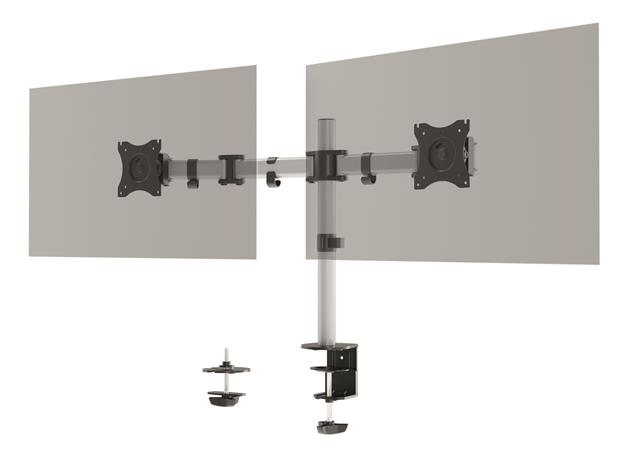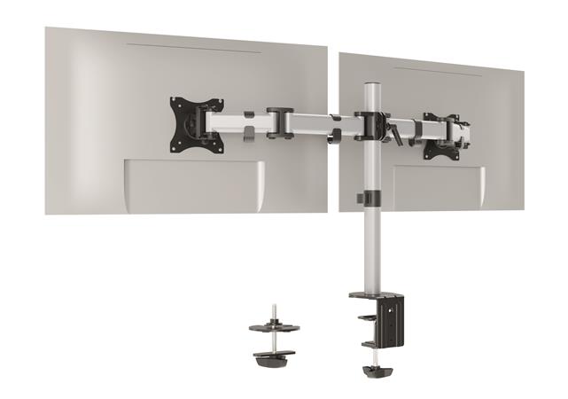 Držiak monitora na 2 obrazovky, s jedinečnou možnosťou montáže, pomocou skrutky a stolovej svorky -ergonomická práca vďaka individuálnemu a jednoduchému nastaveniu výšky, sklonu a polohy monitorov -možno ho jednoducho otáčať o 360°, takže používajte monitor pohodlne aj v režime na výšku alebo na šírku - ramená sú pomocou troch pántov, dajú sa vysunúť až o 36 cm a otočiť až o 180° - výšku obrazoviek možno plynulo nastavovať na 45 cm stĺpe - s univerzálnou štandardnou veľkosťou VESA (75 x 75 mm alebo 100 x 100 mm) - veľkosť 27" a 8 kg - pre štandardné monitory do max.